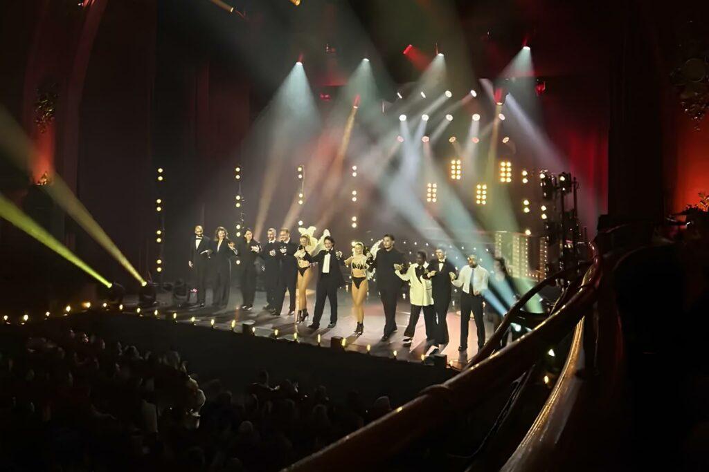 Les lumières s’éteignent. Sur les applaudissements et les cris du public, trois silhouettes apparaissent en hauteur : un homme en smoking, entouré de deux jeunes femmes en tenue de cabaret. Ils descendent sur scène au rythme des claquements de doigts et des faisceaux lumineux. « Cette soirée elle est faite pour que tu oublies tous tes problèmes », lance Samuel Bambi, l’host de la soirée. Pour ceux qui ne le connaissent pas, c’est un acteur et humoriste français, actuellement danseur auprès d’Ana Riera sur le plateau de Danse Avec Les Stars 2026Il installe le ton et prépare le public à ce qui va suivre.